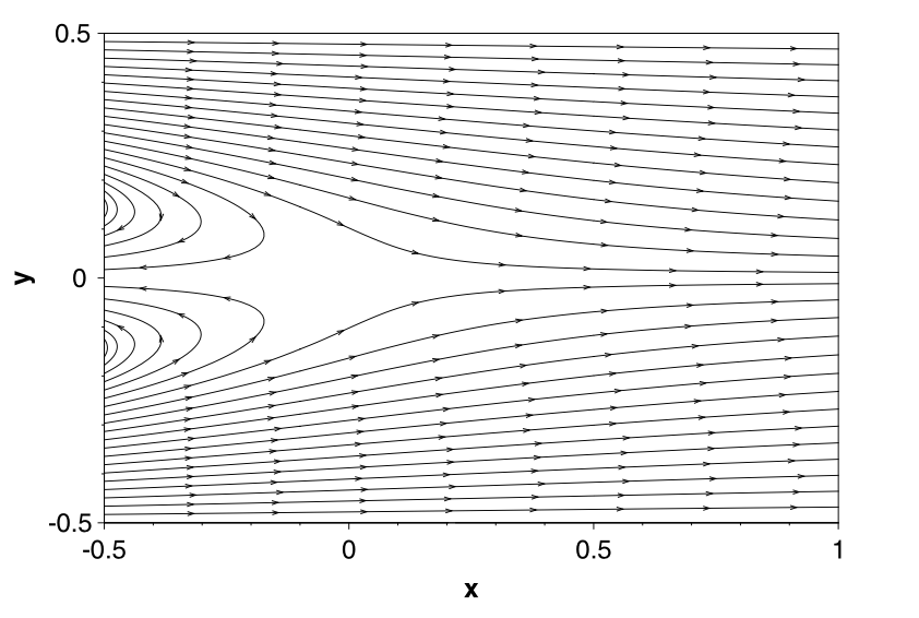 其中,\(\lambda=\frac{1}{2 \nu}-\sqrt{\frac{1}{4 \nu^2}+4 \pi^2}\),\(\nu = 0.025\),计算区域为\([-0.5,1.0]\times[-0.5,0.5]\)。这是一个通过非稳态方程求解的稳态问题,给定初值\(\mathbf{u}_0=\mathbf{0}\),源项\(\mathbf{f}=\mathbf{0}\),速度的 Dirichlet 边界条件由解析解给定。如图所示,解析解可以表示一块挡板后面的流体运动。