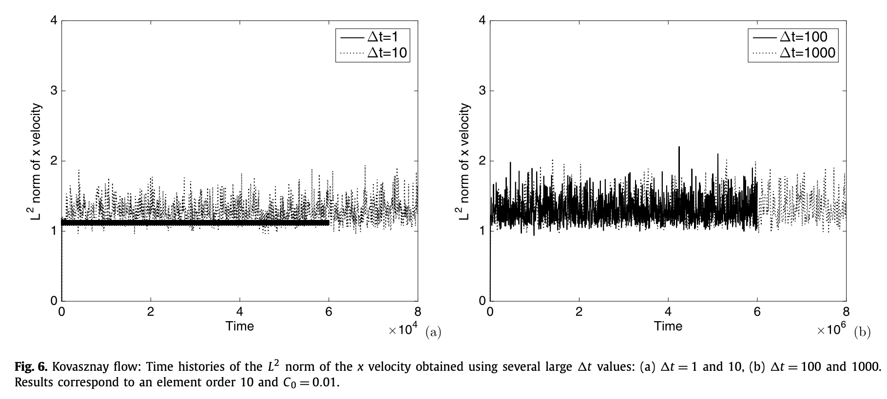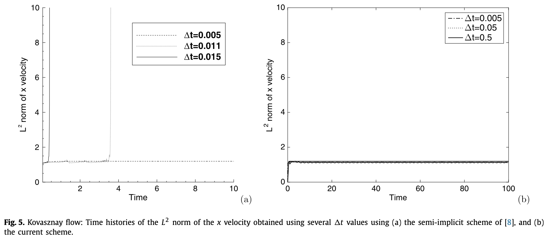 主要的参考文献有两篇1\(^,\)2,验证稳定性的算例有两个,一个是 Kovasznay 流,另一个是圆柱绕流。
